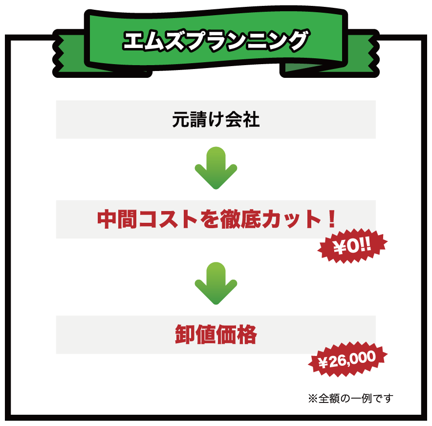 エムズプランニングでは、材料の仕入れに関して下請け業者を通さず、直接仕入れることで中間マージンを徹底カット。 さらにこのページのみでの告知とすることで、通常お客様のお支払い額に混ざっている宣伝広告費もカット! こうすることでお客様に卸値価格でご提供することが可能になったのです。